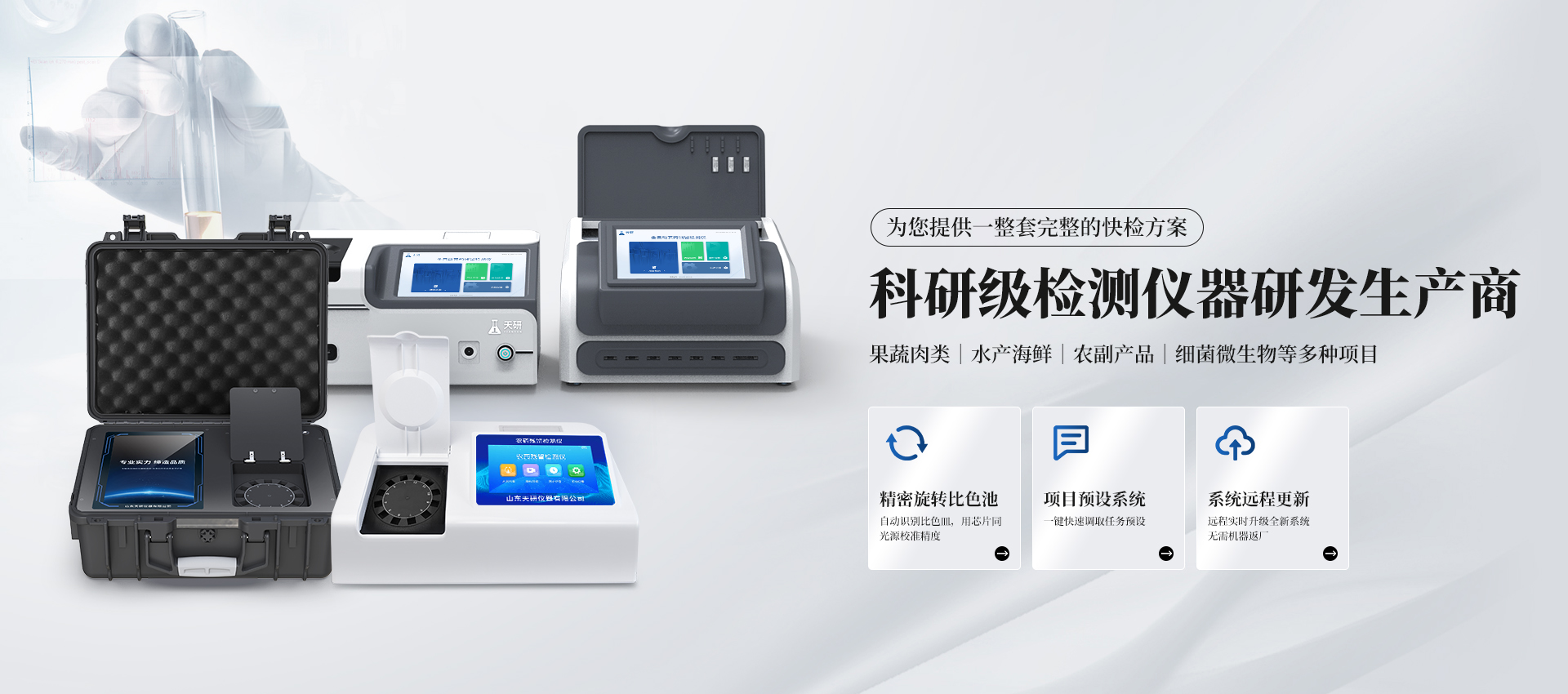 食品安全檢測(cè)儀 農(nóng)藥殘留檢測(cè)儀 獸藥殘留檢測(cè)儀 細(xì)菌微生物檢測(cè)儀 食品添加劑檢測(cè)儀 食安現(xiàn)場(chǎng)快檢箱 土壤養(yǎng)分檢測(cè)儀 植物生理檢測(cè)儀 更多